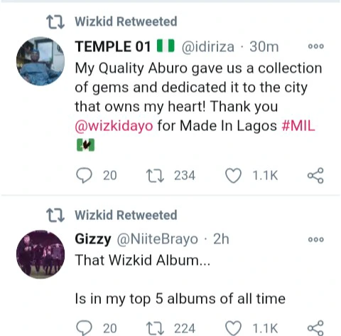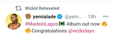 Even today, the first thing Wizkid did on the social media was to acknowledge/retweet posts where more people were congratulating/praising him, he also posted link to his music video, but in all these, he still failed to acknowledge Davido who congratulated him since yesterday. See pictures below;
