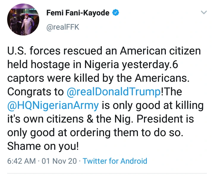 Reports have it that 6 captors were killed before the American was rescued. However, Nigeria's politician who is by the name Femi Fani Kayode has reacted positively to the news as he congratulated President Donald Trump for a job well done, but negatively to the Nigerian Army.