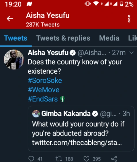 Hours after the USA protected it's kidnapped resident in Nigeria, Aisha Yesufu asked Nigerians an inquiry and I figure each resident of this nation and different nations of the world ought to profoundly ponder, She reacted to an inquiry from Gimba kakanda, Who asked what might your nation do in the event that you are stole abroad, she posed a profound inquiry and I quote Does the nation know about your reality? See the screen capture of the tweet underneath;