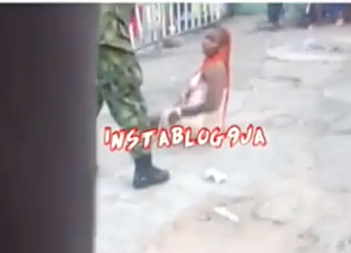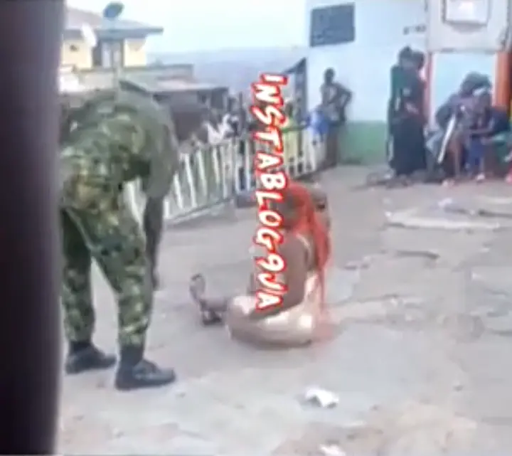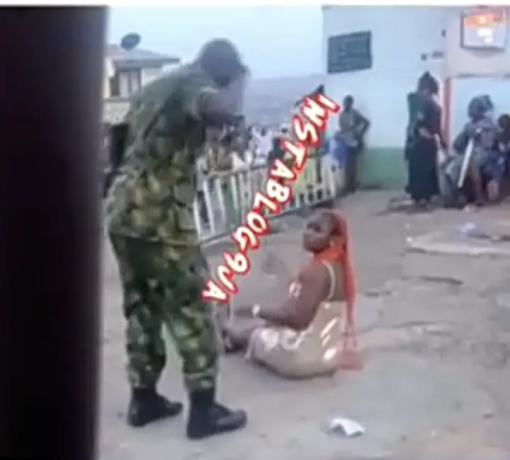 From the video that I watch live and direct, the lady was forced to sit on the ground while she begs the solider not to bit her but the heartless solider keep on beating her, the solider beat her to the extend that she could no longer bear the pains from the beating as she let out a scream.